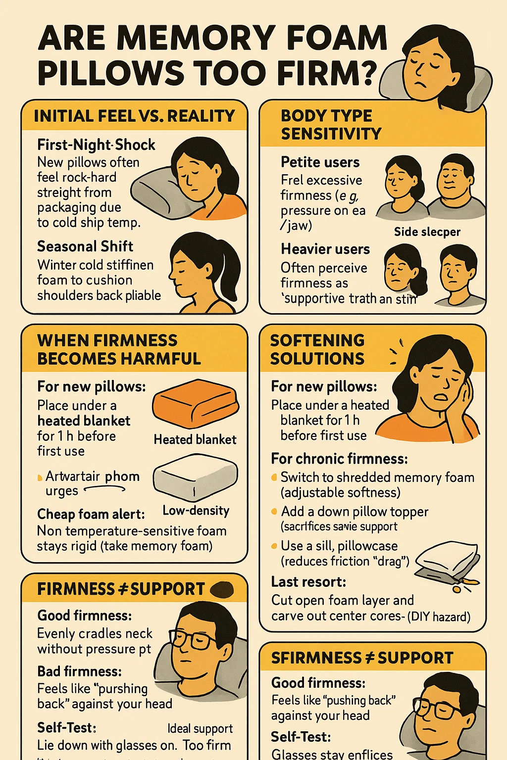 "อาการช็อคในคืนแรก": หมอนใหม่มักจะรู้สึกแข็งทันทีเมื่อแกะบรรจุภัณฑ์เนื่องจากอุณหภูมิในการขนส่งที่เย็น ความร้อนจากร่างกายทำให้โฟมนุ่มลงภายใน 5 นาทีหลังการใช้