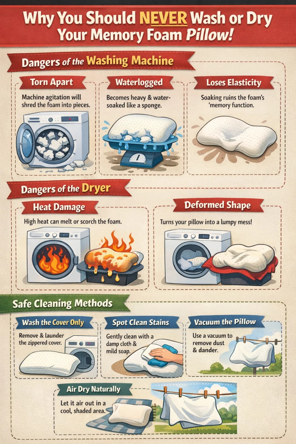 การแช่น้ำเป็นเวลานานควบคู่กับผลกระทบทางเคมีของน้ำยาซักผ้า จะทำลายฟังก์ชัน "หน่วยความจำ" ของเมมโมรีโฟม ทำให้เมมโมรีโฟมไม่โอบรับคอของคุณอีกต่อไปเมื่อคุณนอนหลับ