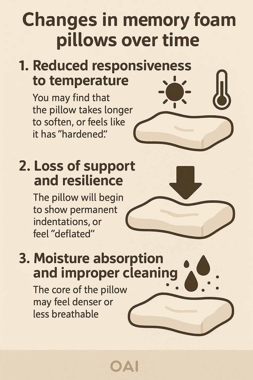 หลังจากบีบอัด บิด และซึมเหงื่อเป็นเวลาหลายพันชั่วโมง โครงสร้างภายในของหมอน (ลองนึกภาพผนังฟองเล็กๆ นับไม่ถ้วน) จะค่อยๆ ล้าและถูกบีบอัดอย่างถาวร