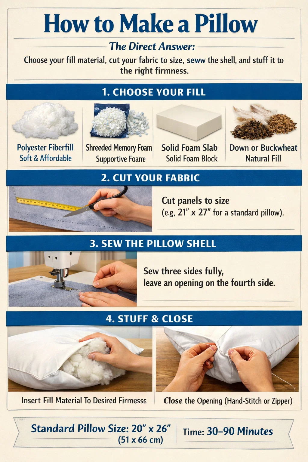 การทำหมอนมีปัจจัยพื้นฐานอยู่สี่ประการ: เลือกวัสดุที่ใช้อุด ตัดผ้าให้มีขนาด เย็บตัวหมอน และยัดให้แน่นพอดี สำหรับคนส่วนใหญ่ หมอนเตียงมาตรฐานมีขนาด 20 × 26 นิ้ว (51 × 66 ซม.) และกระบวนการทั้งหมด ตั้งแต่การตัดผ้าไปจนถึงการปิดตะเข็บสุดท้าย ใช้เวลาประมาณ 30 ถึง 90 นาที ขึ้นอยู่กับประเภทการเติมของคุณ หากคุณกำลังทำงานกับหมอนเมมโมรีโฟม กระบวนการจะแตกต่างออกไปเล็กน้อยเนื่องจากคุณกำลังตัดหรือทำลายโฟมแทนที่จะเติมด้วยเส้นใยที่หลวม แต่วิธีการเชิงโครงสร้างยังคงเหมือนเดิม