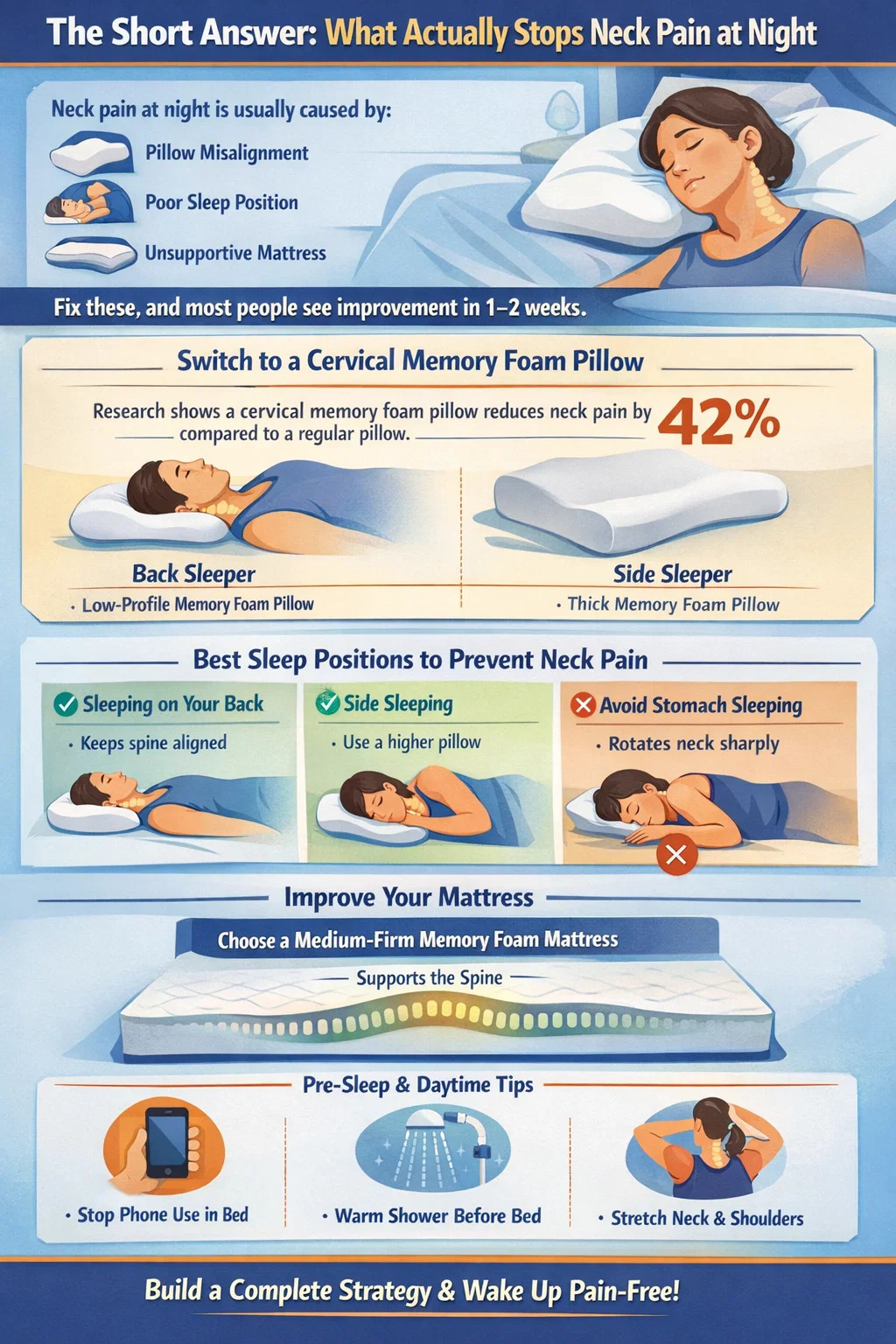 คู่มือนี้อธิบายปัจจัยที่มีส่วนร่วมทุกประการโดยละเอียด เช่น ท่าทางการนอนหลับ การเลือกหมอน การรองรับที่นอน นิสัยก่อนเข้านอน และการยืดกล้ามเนื้อในแต่ละวัน ดังนั้นคุณจึงสร้างกลยุทธ์ที่สมบูรณ์ได้ แทนที่จะเปลี่ยนผลิตภัณฑ์เพียงชิ้นเดียวและหวังสิ่งที่ดีที่สุด