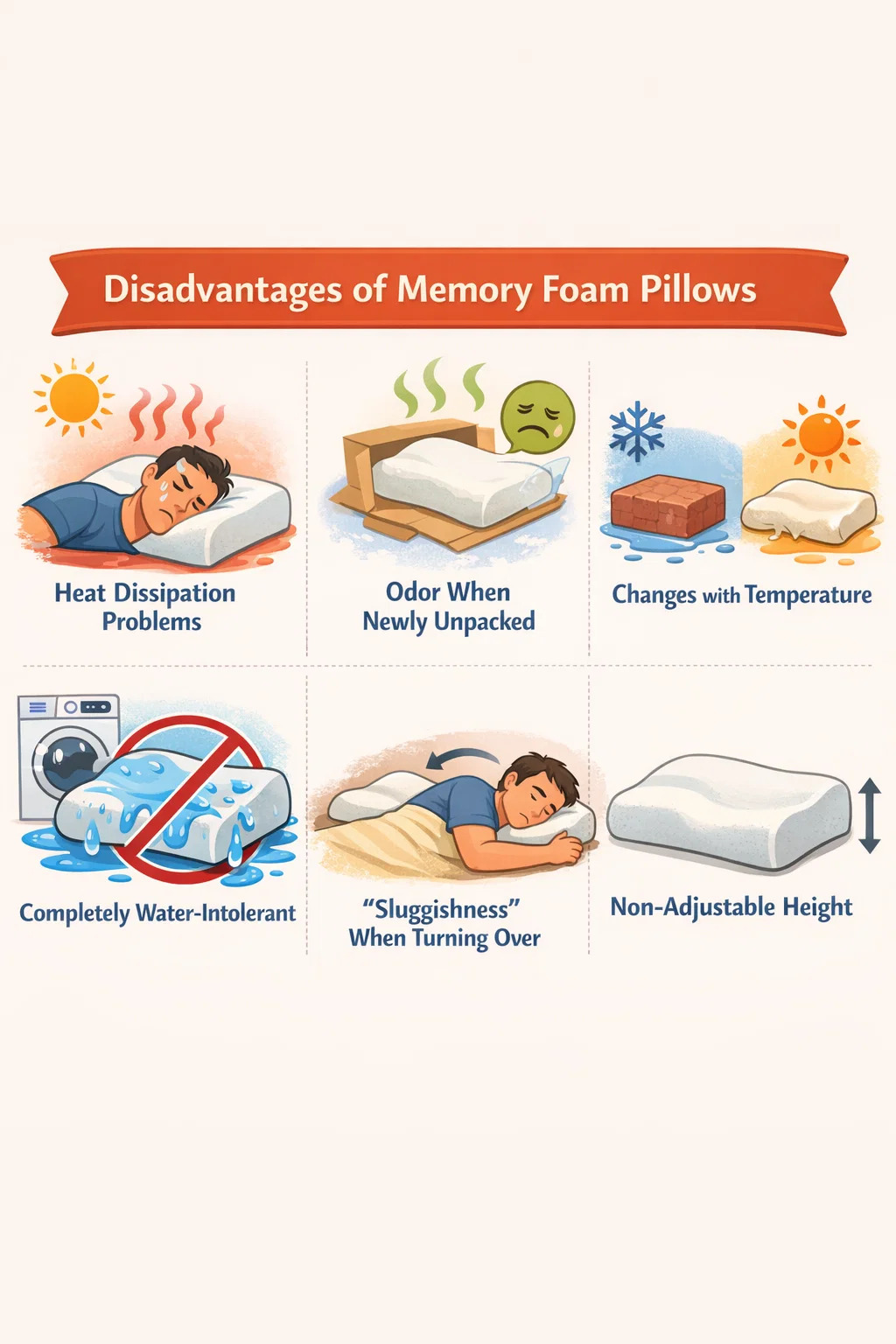 แข็งในฤดูหนาว นุ่มในฤดูร้อน: ในห้องที่ไม่มีเครื่องทำความร้อนในฤดูหนาว หมอนเมมโมรีโฟมอาจให้ความรู้สึกแข็งเหมือนอิฐ ทำให้คุณต้อง "อุ่น" ด้วยศีรษะสักพักก่อนที่จะค่อยๆ นิ่มลง ในฤดูร้อนที่ร้อนจัด มันอาจจะนิ่มเกินไปและขาดการรองรับที่เพียงพอ