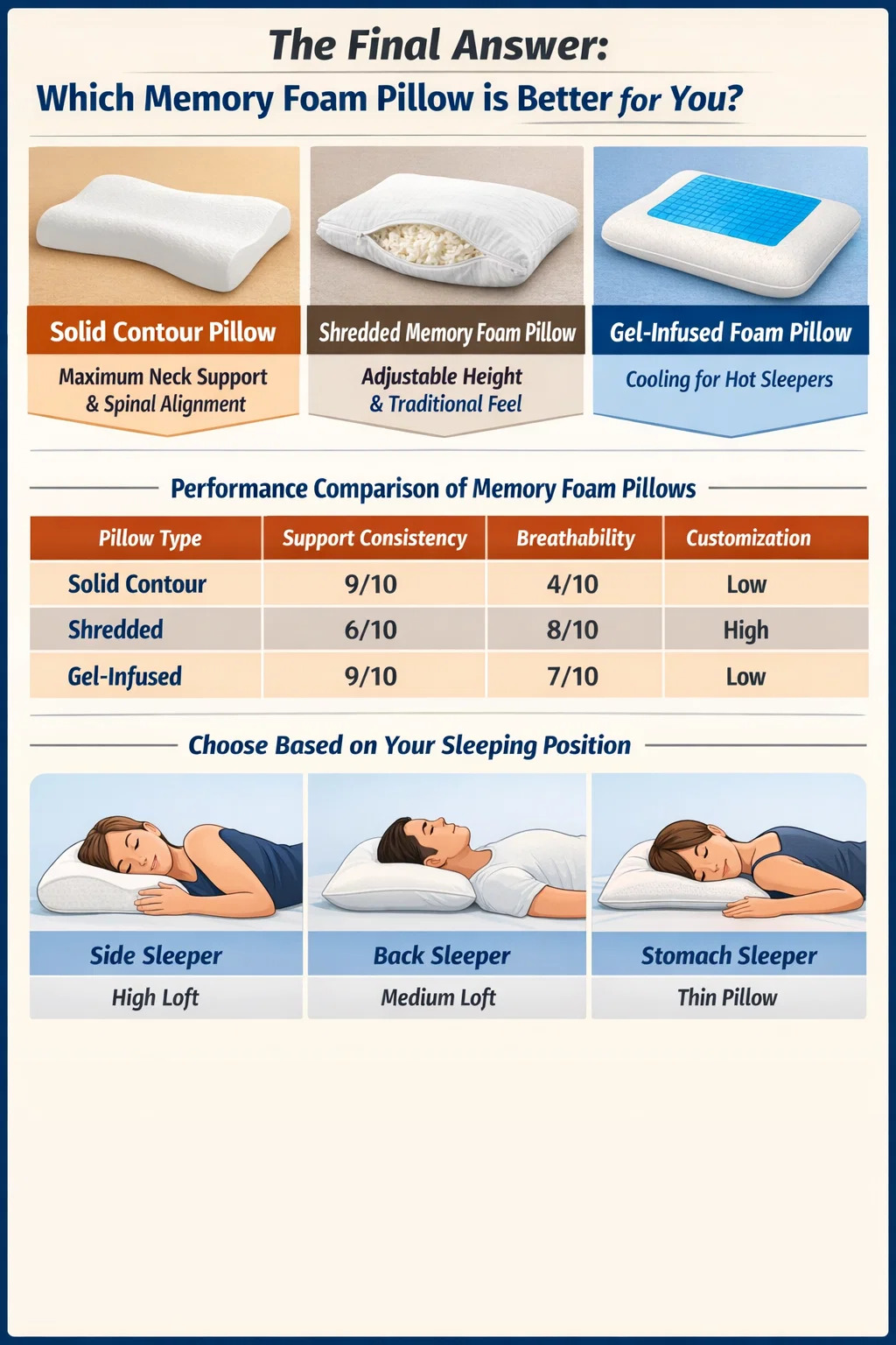 ไม่มีหมอนที่ "ดีที่สุด" สักใบเดียว แต่มีผู้ชนะที่ชัดเจนโดยพิจารณาจากนิสัยการนอนของคุณ หากคุณให้ความสำคัญกับการรองรับคอและกระดูกสันหลังให้มากที่สุด หมอนเมมโมรีโฟมเนื้อแข็ง จะดีกว่า หากคุณชอบสัมผัสแบบดั้งเดิมพร้อมความสามารถในการปรับความสูงได้ หมอนเมมโมรีโฟมฝอย เป็นทางเลือกที่ดีกว่า สำหรับผู้ที่ตื่นขึ้นมามีเหงื่อออกบ่อยๆ หมอนเมมโมรีโฟมแบบเจลหรือแบบเซลล์เปิด เป็นทางเลือกเดียวที่สามารถป้องกันความร้อนสูงเกินไปได้